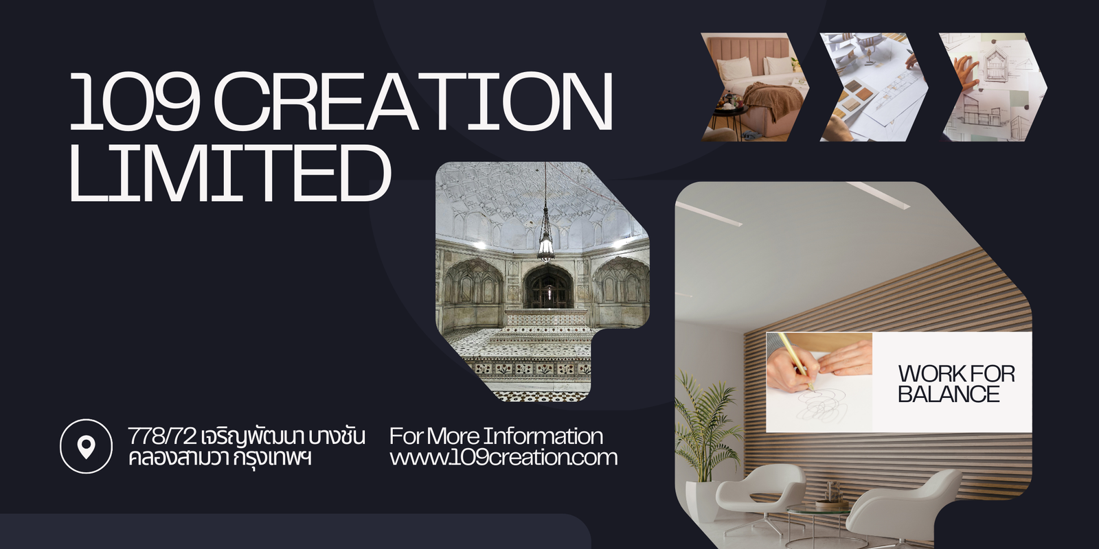 ห้างหุ้นส่วนจำกัด 109 ครีเอชั่น เป็นองค์กรที่ดำเนินธุรกิจด้านการพัฒนาโครงการ งานสร้างสรรค์ และการให้คำปรึกษาทางธุรกิจ โดยมุ่งเน้นการให้บริการที่มีคุณภาพและมาตรฐาน เพื่อสนับสนุนการดำเนินงานของลูกค้าในหลากหลายภาคธุรกิจ บริษัทมีความตั้งใจในการสร้างผลงานที่มีคุณค่า สามารถตอบสนองความต้องการของลูกค้าได้อย่างมีประสิทธิภาพ และช่วยสนับสนุนการเติบโตของธุรกิจในระยะยาว