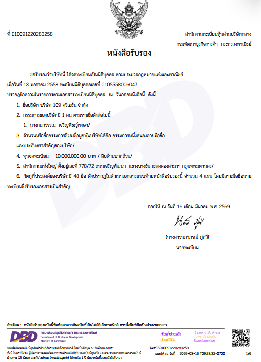บริษัท 109 ครีเอชั่น จำกัด ดำเนินธุรกิจอย่างถูกต้องตามกฎหมายของประเทศไทย โดยมีการจดทะเบียนจัดตั้งนิติบุคคลตามพระราชบัญญัติห้างหุ้นส่วนและบริษัท และดำเนินธุรกิจภายใต้ข้อกำหนดของหน่วยงานภาครัฐที่เกี่ยวข้อง